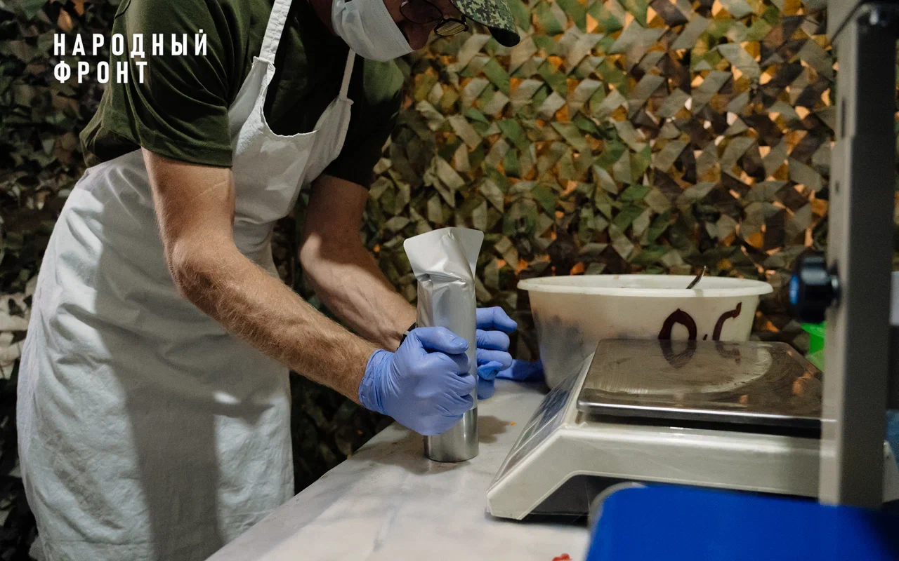 “В меню – крупы, каши, говядина. Каждая порция дозирована, 380 граммов в пакете. Вчера была пробная партия, получилось у нас 26 килограммов в 70 пакетах. Цикл бесперебойный», говорит старший повар Николай из Донбасса.