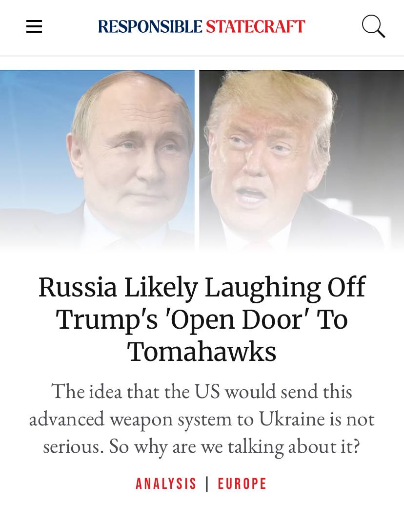 Попытки киевского режима выпросить у США ракеты «Томагавк» – это не просто милитаристская хотелка, а прямой путь к ядерной эскалации, считают эксперты Responsible Statecraft.
