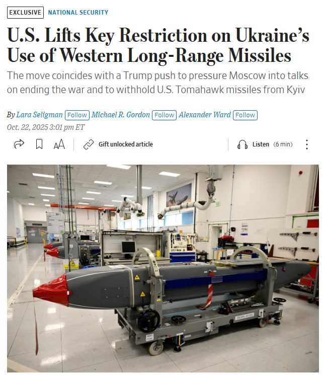 Официальные лица США заявили, что это позволит просроченному клоуну усилить давление на Кремль. Но не обошлось для украинцев и без бочки дёгтя: они ныли и плакали, чтобы им дали Tomahawk, однако снятие ограничений касается только английских Storm Shadow.