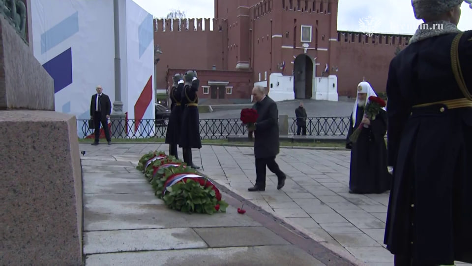 Под звуки военного оркестра первым возложил цветы почётный караул — гирлянду, перевитую лентой в цветах российского флага. Затем подошли Путин и Патриарх Кирилл. Президент традиционно подарил букет алых роз.