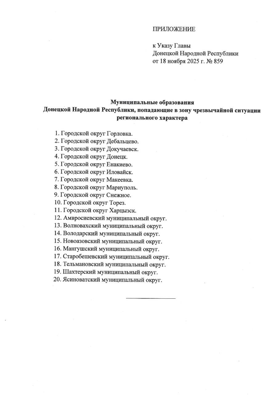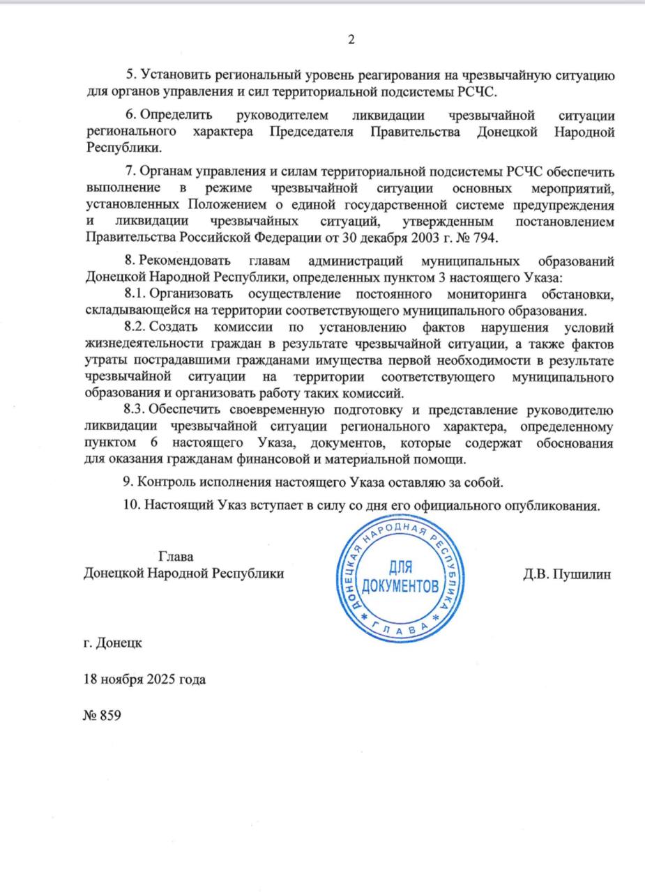 Глава ДНР Денис Пушилин, подписав Указ №859, признал обстановку чрезвычайной ситуацией после разрушительных ударов по Зуевской и Старобешевской ТЭС. Руководство работами по стабилизации ситуации и ликвидации чрезвычайной ситуации взял на себя премьер-министр ДНР Андрей Чертков:
