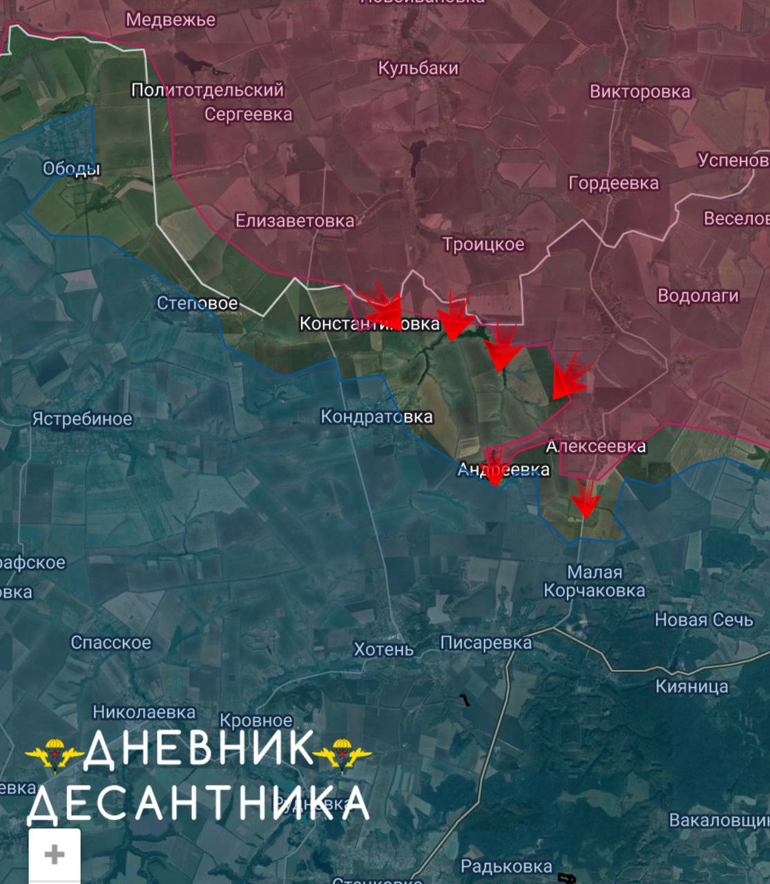В Константиновке противник накапливает пехотные группы и активно использует БПЛА, что серьёзно затрудняет продвижение наших войск. ВС РФ, расширив контроль в южной части города, ведут борьбу с операторами и инфраструктурой вражеских дронов. Ожесточённые бои также идут на рубеже Клиновое-Веролюбовка-Марково и в Миньковке.