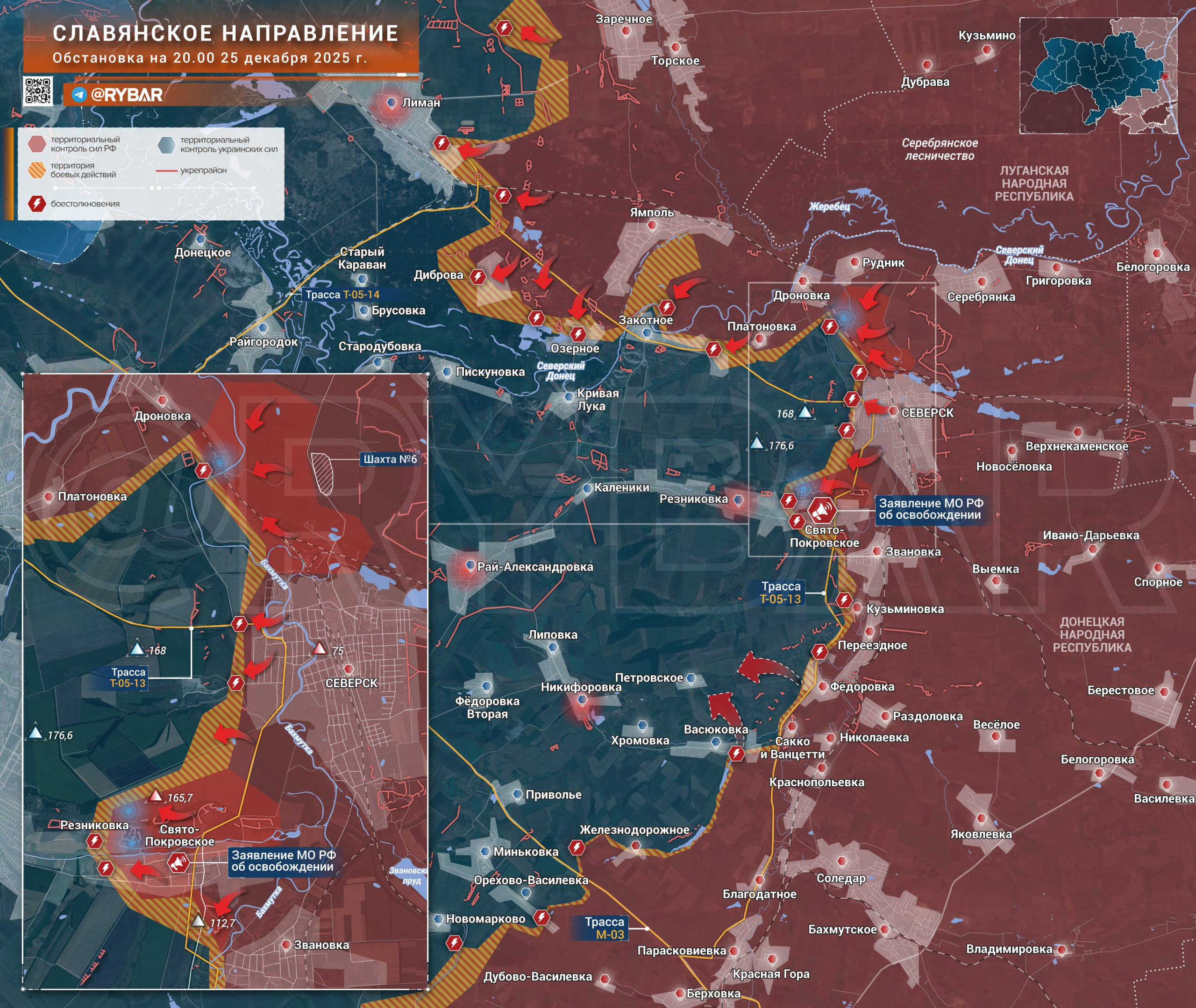 На этом направлении реализуется операция по охвату Красного Лимана с юга. Войска РФ продвигаются на рубеже Александровка – Яровая. Продолжаются сражения за Закотное, где наши подразделения расширяют зону контроля. Также идёт наступление в районе Пазено и Резниковки.