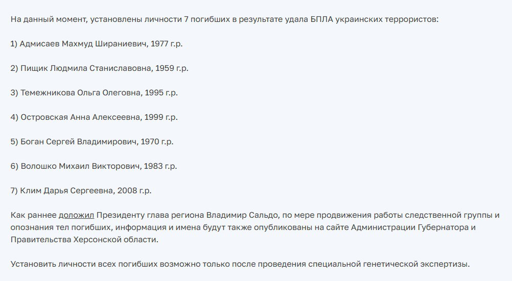 В результате террористической атаки беспилотниками киевского режима в Херсонской области погиб 27 человек, в том числе двое несовершеннолетних.