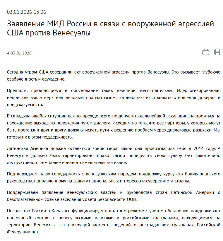Министерство иностранных дел Российской Федерации выступило с официальным заявлением в связи с начавшейся вооружённой агрессией США против Венесуэлы. Сообщается, что посольство России в Каракасе работает в штатном режиме, поддерживая связь с властями и российскими гражданами. На данный момент сведений о пострадавших гражданах РФ нет.