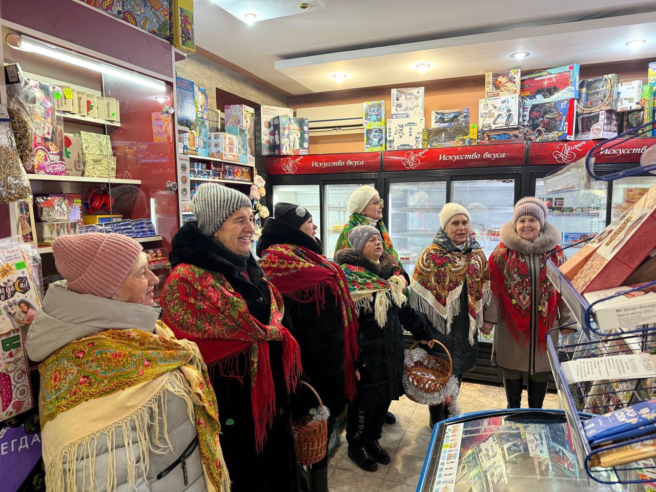 Зугрес: Участники народного вокального коллектива «Калинка» прошли с рождественскими колядками по магазинам города, поздравляя жителей с праздником и создавая атмосферу народного гуляния.
