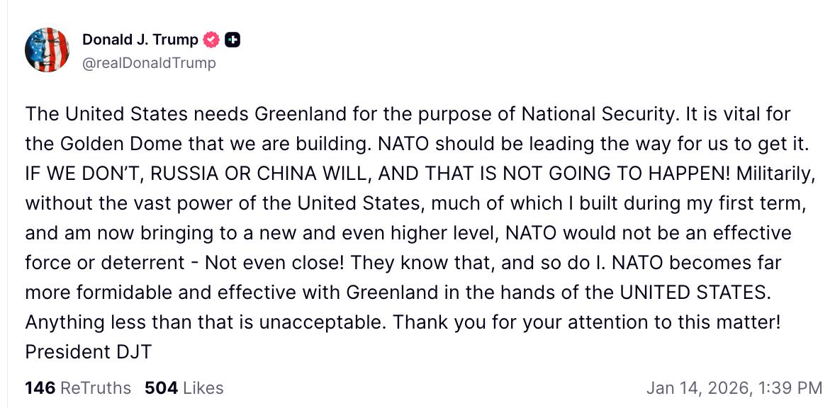 По его мнению, передача Гренландии в руки Вашингтона — это единственный способ сделать западный блок по-настоящему грозным и эффективным. Любые другие варианты развития событий президент называет абсолютно неприемлемыми и требует от мирового сообщества признать главенствующую роль Америки в этом вопросе.