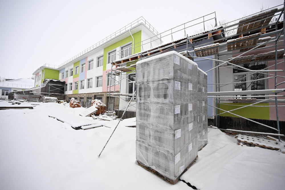 Кровельные и фасадные работы в трех корпусах школы выполнены на 90%. На здании уже установлены новые окна. Строители монтируют инженерные сети и системы вентиляции, а также ведут чистовую отделку учебных классов и пищеблока. Ежедневно на объекте задействовано около 60 рабочих.