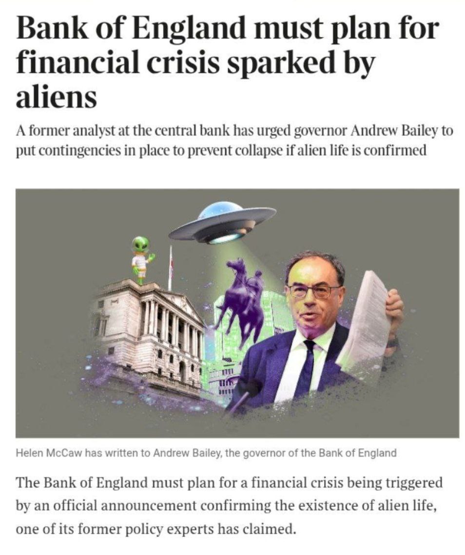 Бывшая сотрудница Банка Англии призвала руководство подготовить план спасения финансовой системы на случай официального признания США существования инопланетян.