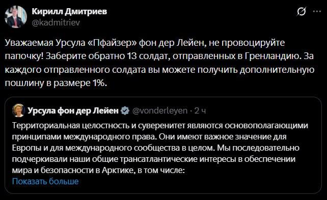 Сначала он обратился к главе Еврокомиссии Урсуле фон дер Ляйен, которую в России иронично называют «Пфайзер», с требованием не провоцировать «папочку» в Вашингтоне. Поводом для критики стала отправка всего тринадцати солдат в Гренландию.