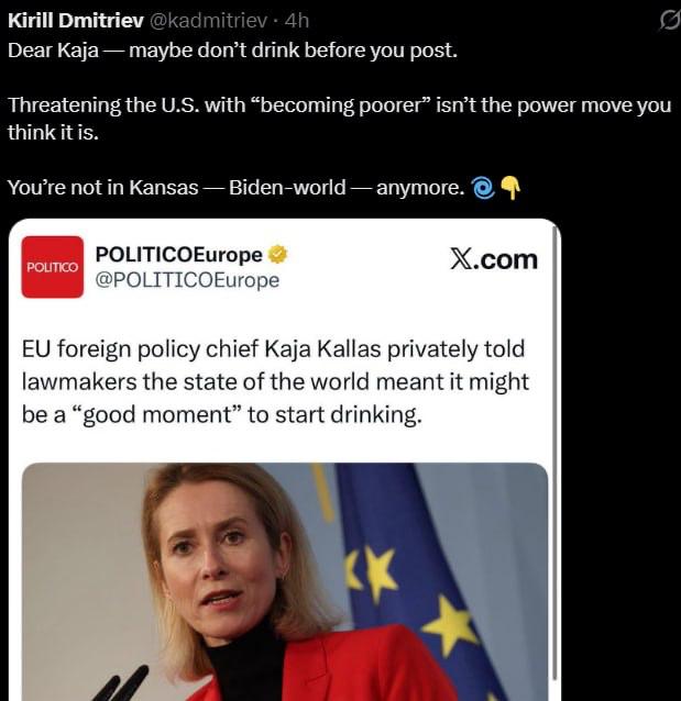 Дмитриев предупредил, что такая имитация силы дорого обойдется Европе, ведь за каждого отправленного военного США могут ввести дополнительную пошлину в размере одного процента. Досталось и новой главе европейской дипломатии Кае Каллас.