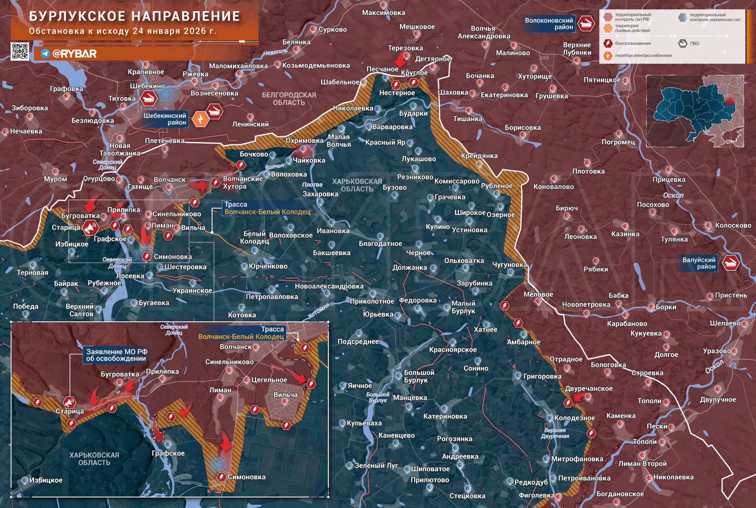 Министерство обороны подтвердило полное освобождение Старицы. Вместе с тем бойцы зашли на территорию Симоновки. Кадры военкоров отсюда показывают, что как минимум половина села освобождены. Другие данные говорят, что оно вообще полностью перешло под наш контроль.