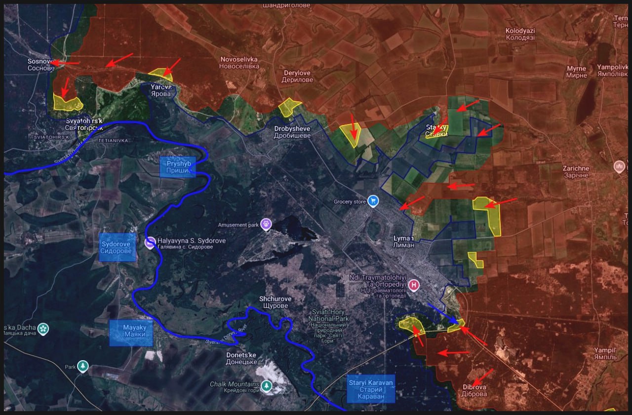 Российская армия развивает стратегический успех, полностью восстановив контроль над Старицей и зашли в Симоновку. Одновременно с этим сжимается кольцо вокруг Красного Лимана, где перерезаны основные пути снабжения ВСУ.