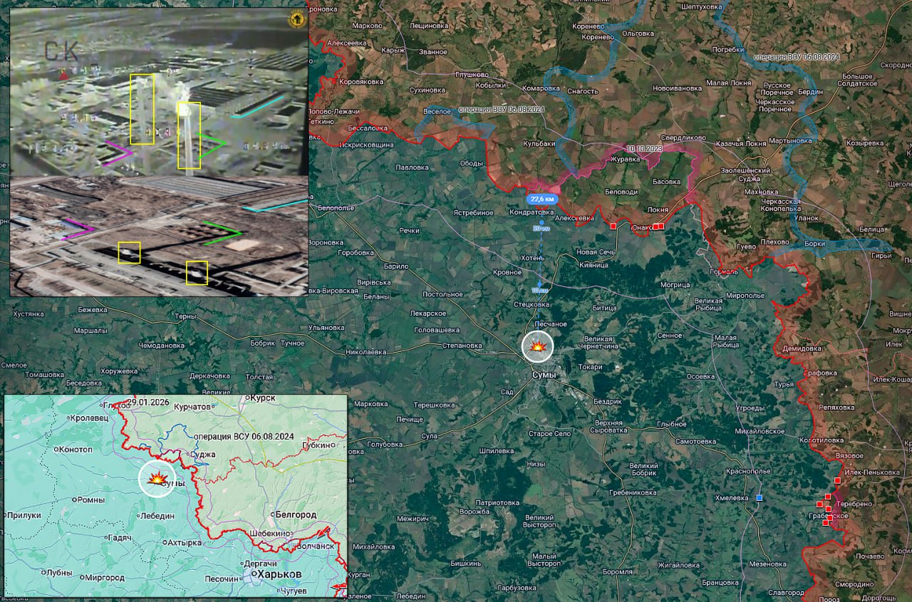 На Курском микрорайоне Сум зафиксировано уничтожение инфраструктурного объекта: тактический FPV-дрон поразил котельную северного промузла на удалении более 20 км от ЛБС. В районе Теткино артиллерия и авиация наносят превентивные удары по любым выявленным скоплениям живой силы и техники врага. Командование ВСУ вынуждено экстренно перебрасывать резервы для купирования угроз на новых участках прорыва.