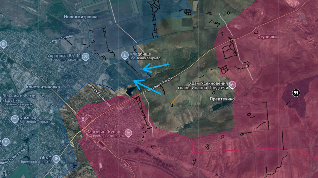 В Константиновке российские штурмовики все активнее просачиваются в центральные кварталы города, ведя бои за каждое здание. Противник начал частичный отвод основных сил с участков западнее Предтечино, однако сохраняет точечное присутствие малых групп для сдерживания нашего продвижения. В районах Берестка и Ильиновки продолжаются позиционные бои, сопровождающиеся интенсивной работой артиллерии с обеих сторон. Штурмовые подразделения РФ используют тактику малых групп, что позволяет эффективно обходить опорные пункты врага в условиях городской застройки. Контроль над центральной частью города остается главной целью текущей фазы операции.