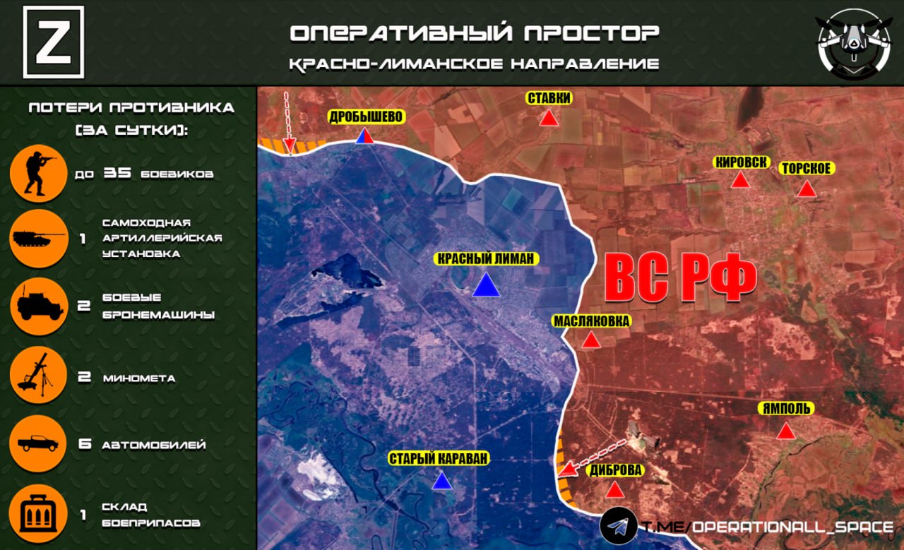 Начался генеральный штурм Красного Лимана: русская армия наступает с северо-востока и одновременно продвигается в южной части города. Отступающий гарнизон ВСУ рискует попасть в клещи, так как пути отхода методично перерезаются. Бои охватили Святогорск, Александровку и Яровую, делая организованную эвакуацию украинских сил практически невозможной. Противник деморализован масштабным натиском с нескольких направлений и потерей контроля над ключевыми путями снабжения в лесных массивах на подступах к городу.