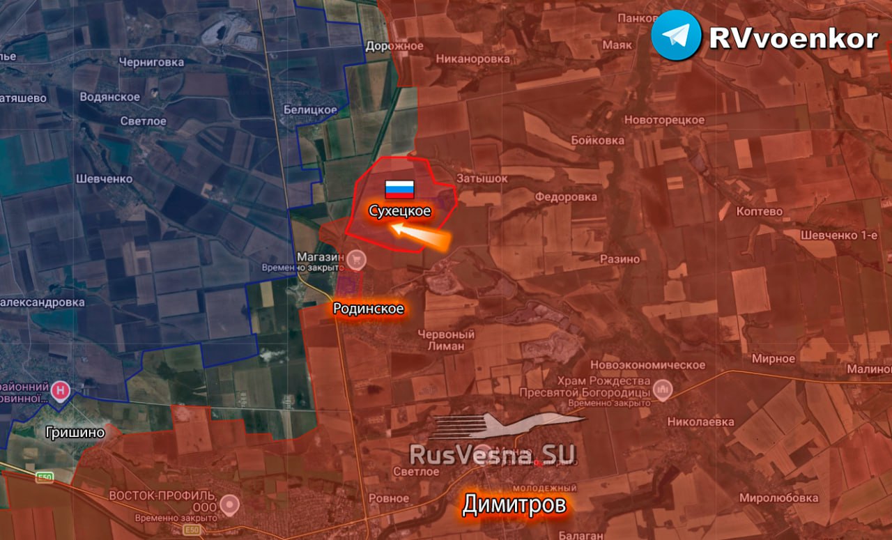 Штурмовые подразделения вышли к западной окраине второго пруда в Гришино, продолжая продвижение внутри красноармейско-димитровской агломерации. Выше по фронту ведется подготовка плацдарма в районе Шаховского укрепрайона перед линией обороны ВСУ вдоль реки Грузская. Армии России предстоит преодолеть сложный участок между Золотым Колодезем и Красным Кутом, рассекая его по центру и одновременно продавливая правый фланг в районе Павловки.