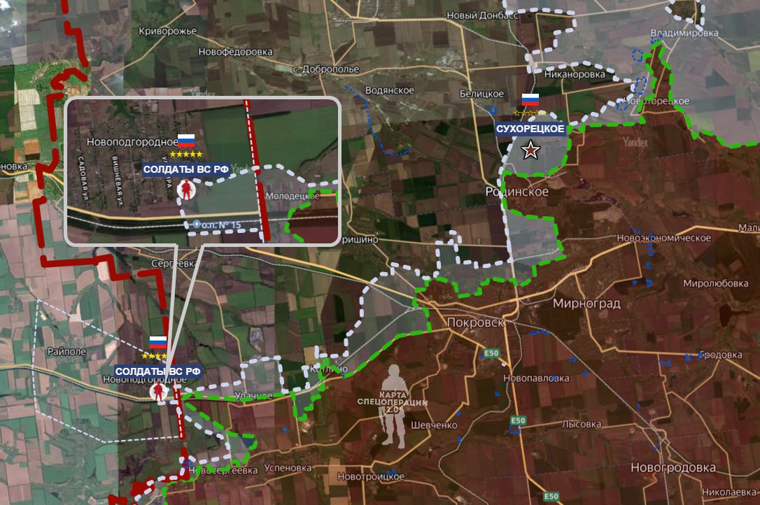 Минобороны РФ официально подтвердило освобождение села Сухецкое к северу от Покровска, что спрямляет линию фронта на этом участке. В самом Гришино продолжаются ожесточенные бои в городской застройке, штурмовые группы планомерно вытесняют противника к западным окраинам. Зафиксировано движение российской пехоты на окраинах Новоподгорного, соседнего с Молодецким.