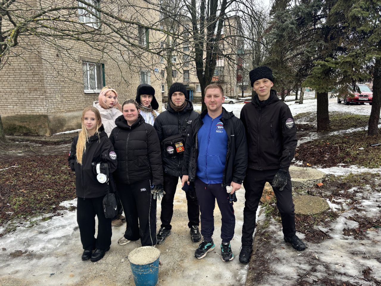 Безопасный гололед в Амвросиевке. Казачья молодежь и «Движение Первых» вышли на улицы микрорайона Черемушки, чтобы посыпать тротуары песком. Глава округа призвал жителей последовать примеру ребят и обезопасить дорожки у своих подъездов.
