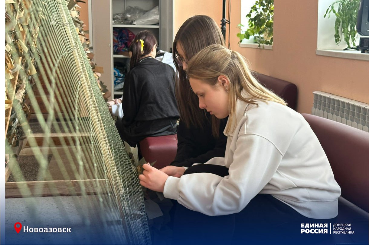 Маскировочные сети в Новоазовске. В школе №1 ученики и педагоги еженедельно передают на фронт по две сети. Ребята сами освоили сложные узлы, чтобы помогать бойцам на передовой.