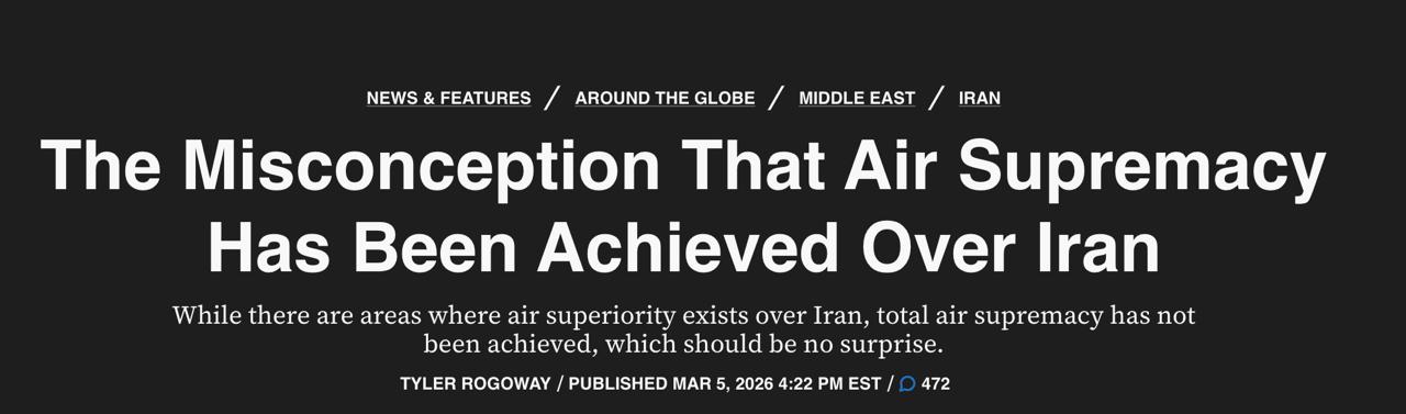 Как пишет издание War Zone, американская и израильская авиация добилась превосходства лишь на отдельных участках, но о полной свободе действий речи пока не идёт. Сейчас силы коалиции переходят к тактике точечных ударов со средних дистанций, что позволит расширить список целей, включая заглублённые бункеры.