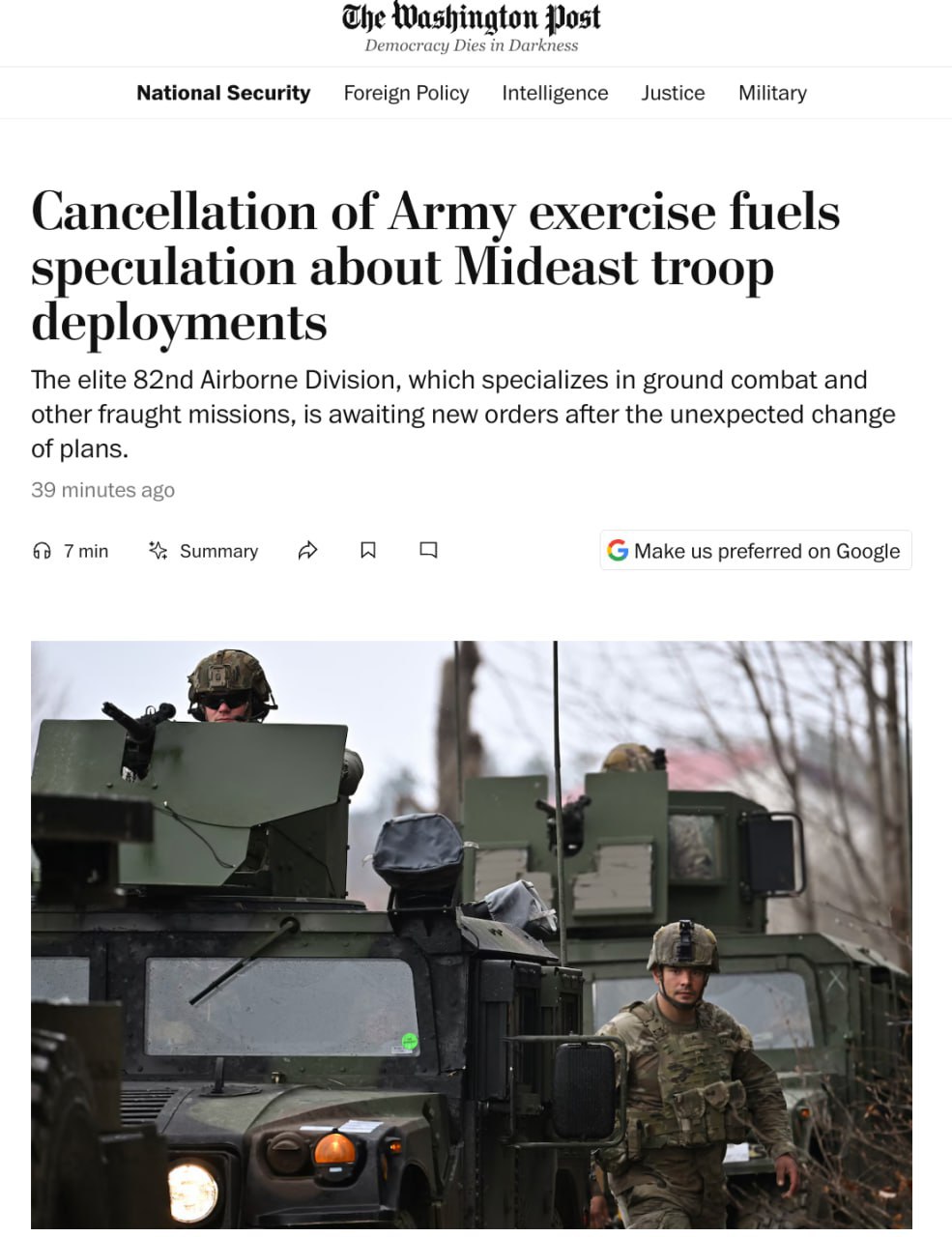 Соединенные Штаты экстренно прекратили учения элитной 82-й воздушно-десантной дивизии для ее срочной отправки на Ближний Восток.