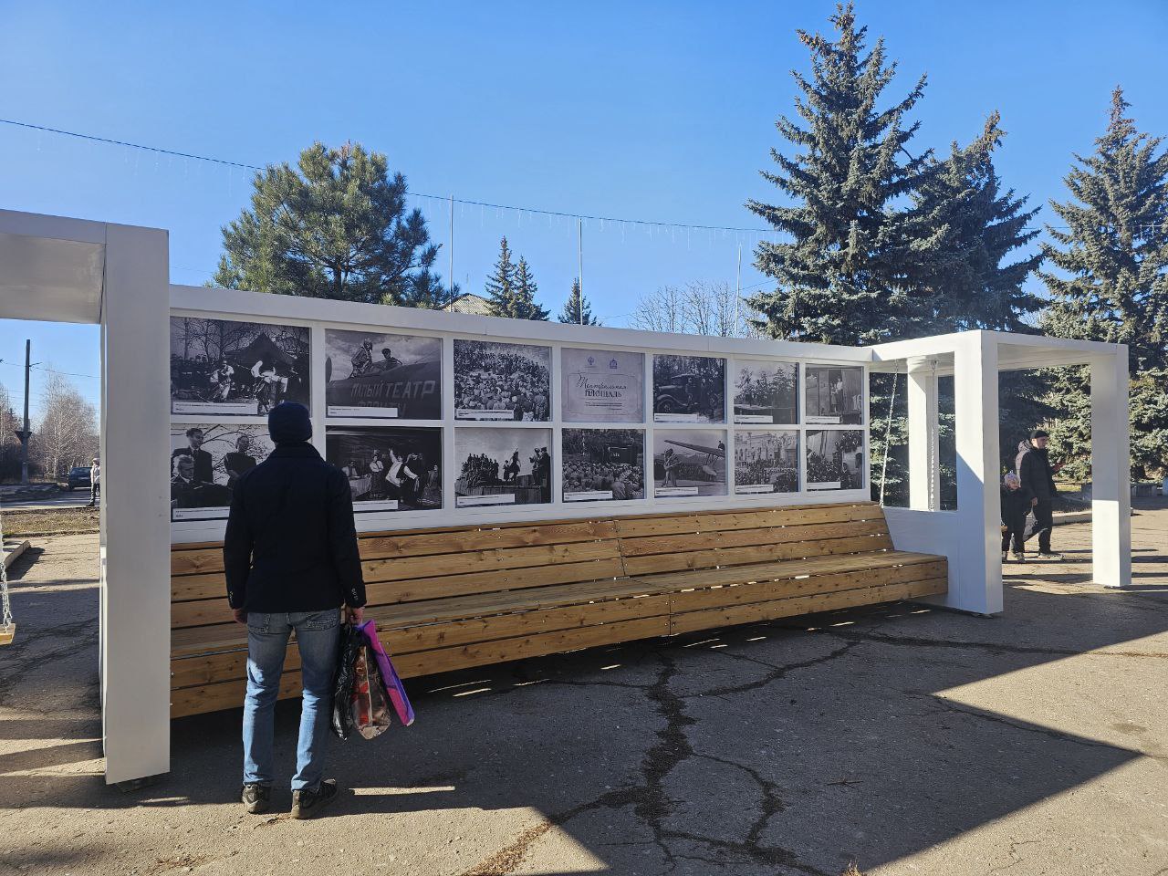В поселке Мироновский открыли уникальную уличную площадку «Театральная площадь». Конструкция совмещает в себе фотовыставку об истории фронтовых бригад ВОВ и зону отдыха с качелями.