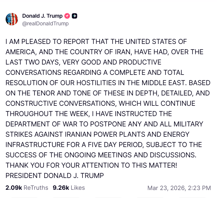 По его словам, после первых двух дней «глубоких, подробных и конструктивных» переговоров, которые ещё продолжатся в течение недели, он поручил «Министерству войны» отложить любые военные удары по иранским электростанциям и энергетической инфраструктуре на пять дней.