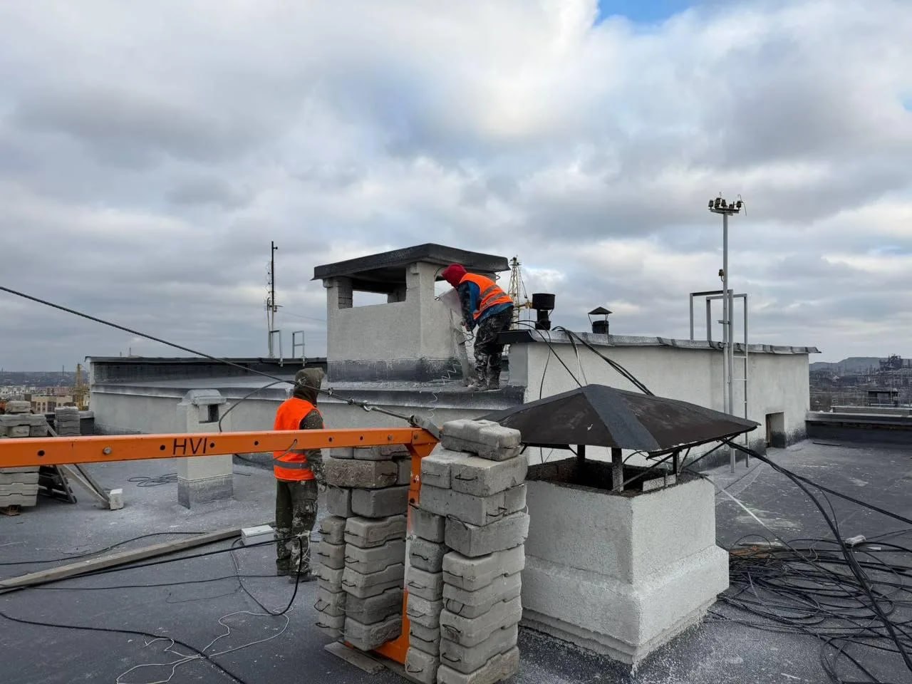 Мариуполь. Строители ведут отделку фасада многоквартирного дома на проспекте Металлургов. На крыше здания идут финишные работы по ремонту вентиляционных шахт.