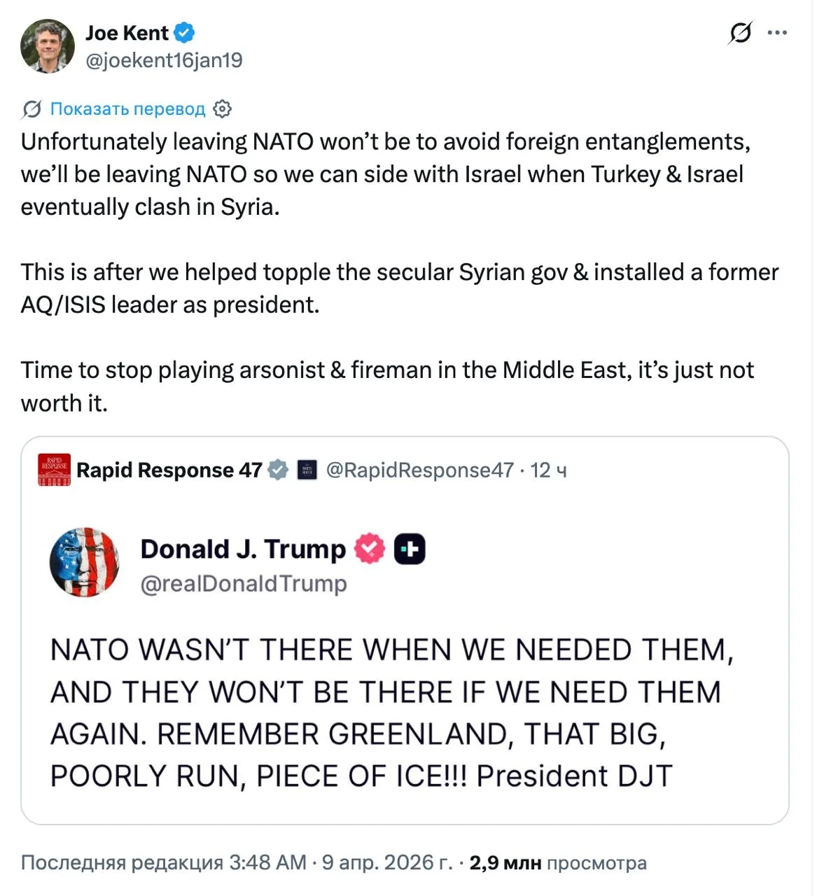 Бывший директор контртеррористического центра США Джо Кент, ушедший в отставку из-за несогласия с войной против Ирана, считает, что Америке придётся выйти из НАТО, когда в Сирии столкнутся Израиль и Турция.