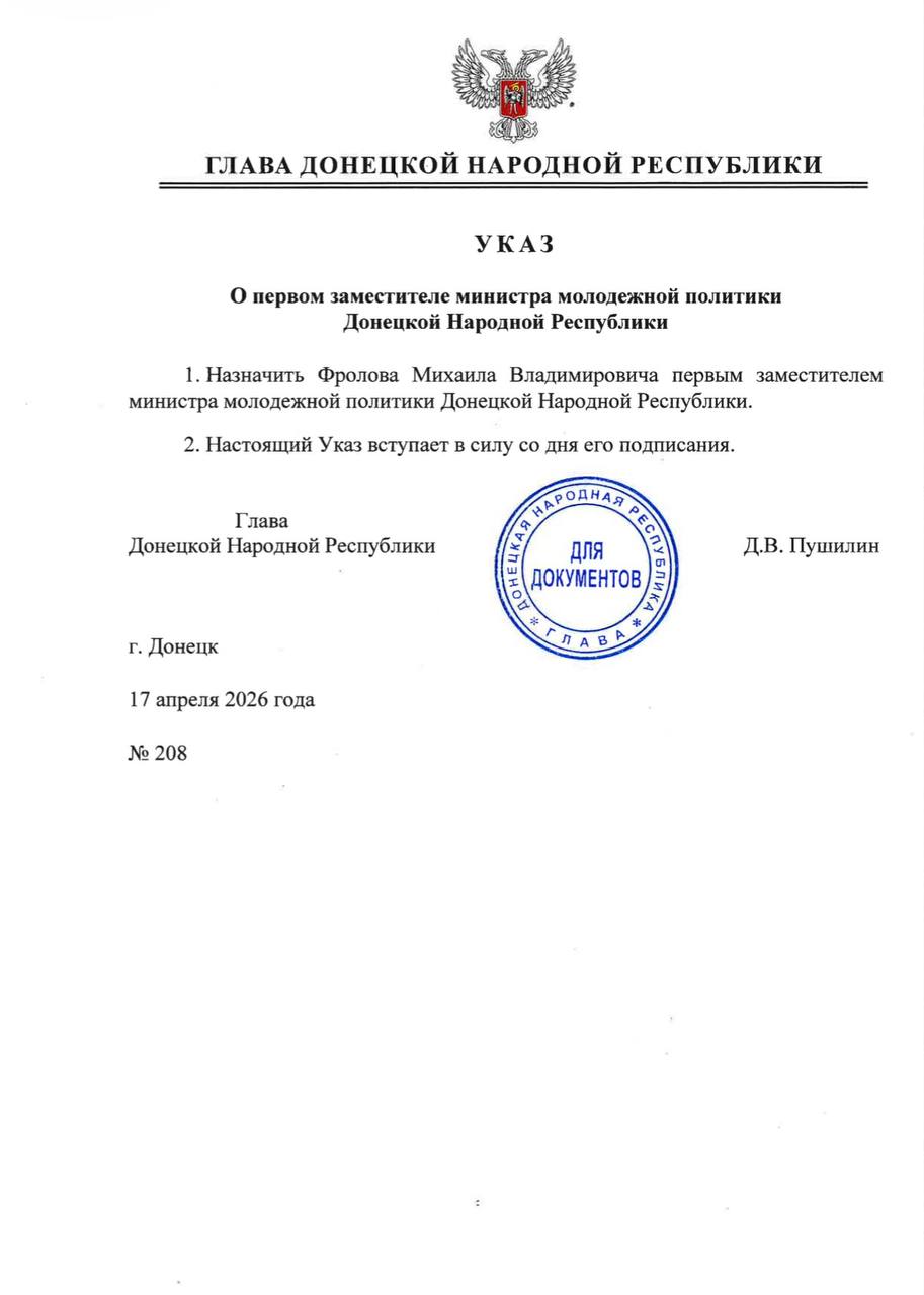 Новый первый замминистра Михаил Фролов до своего назначения непосредственно занимался развитием и поддержкой проектов для молодежи ДНР, что, по всей видимости, сыграло решающую роль при выборе кандидата. Его профессиональный путь внутри министерства свидетельствует о глубоком понимании текущих вызовов и стратегических целей в сфере работы с новым поколением.
