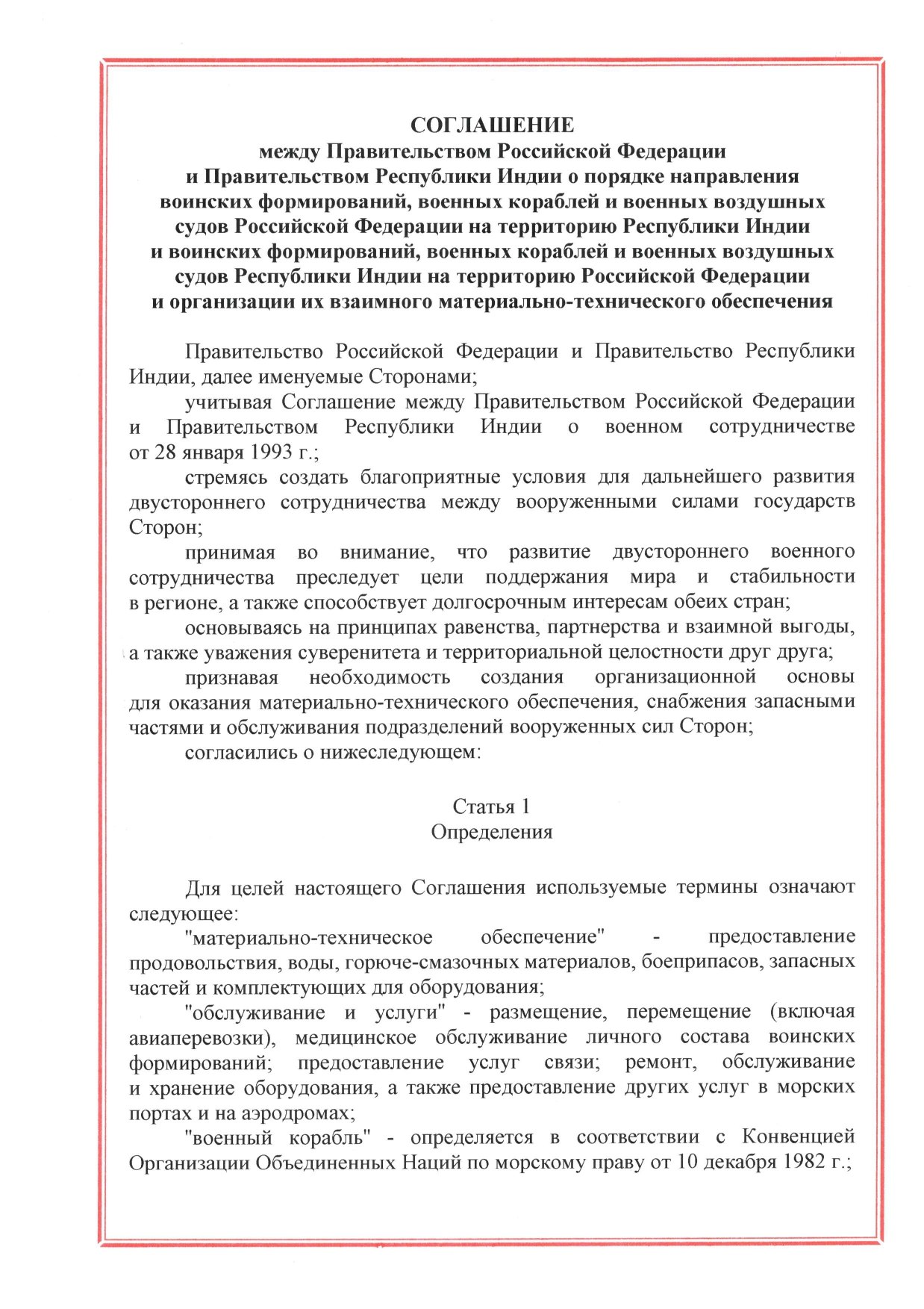 Россия и Индия заключили межправительственное соглашение, которое позволяет сторонам размещать на территории друг друга воинские контингенты. Документ опубликован на официальном портале правовой информации.