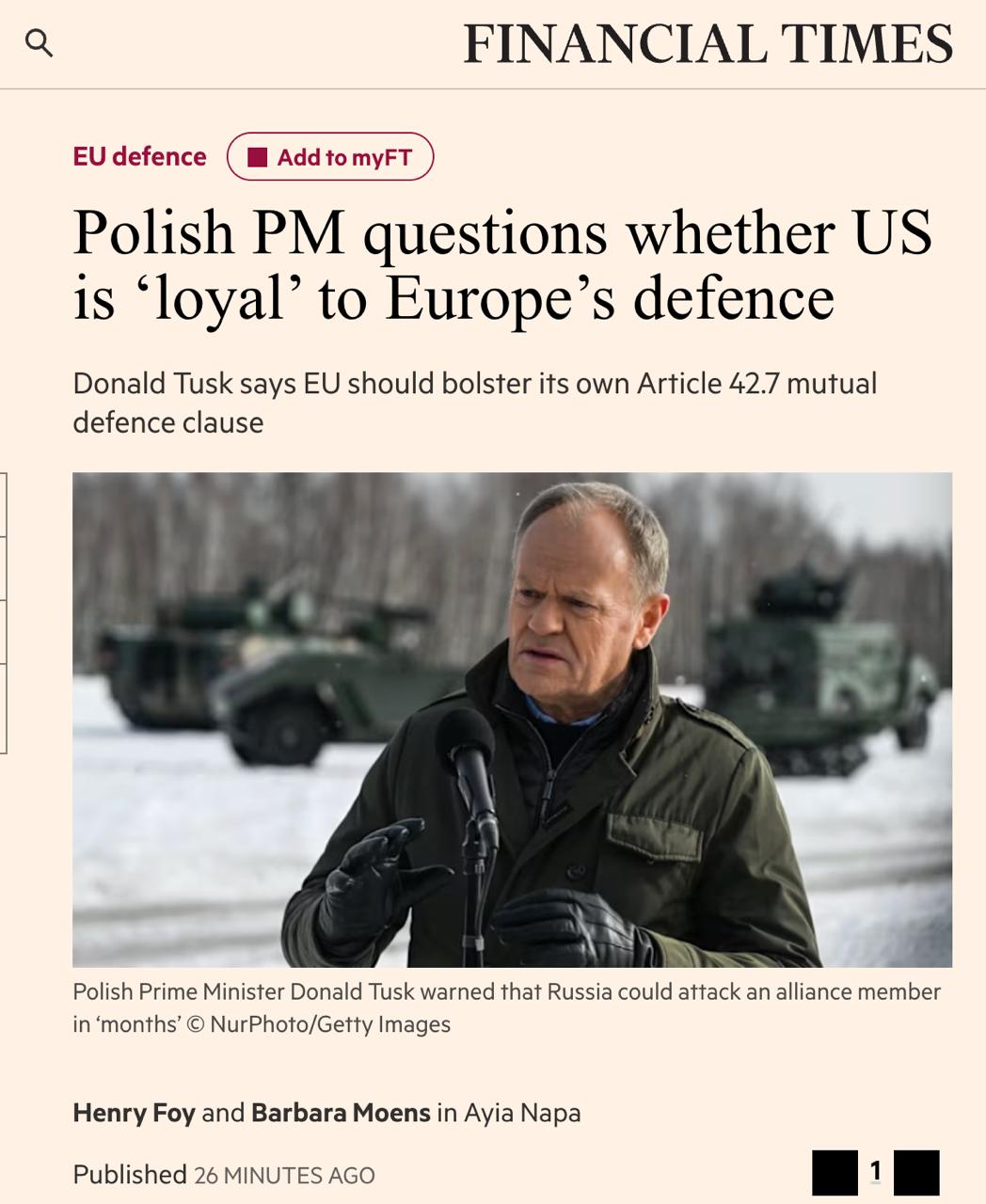 Туск заявил, что Россия может напасть на НАТО уже через несколько месяцев, и выразил сомнения в готовности США защищать Европу в таком случае, хотя и надеется на выполнение союзнических обязательств.